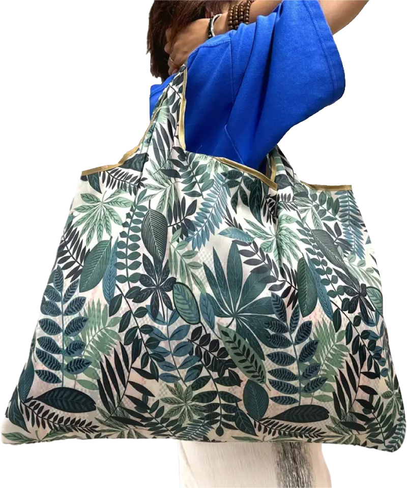 This large size, foldable, reusable, lightweight bag is great to use for your grocery trips or running errands. Printed with a tropical leaf pattern and made with lightweight, water-resistant nylon.